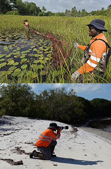 Monitoring activities include biodiversity and critical habitat, wetland, mangrove, avifauna, diatoms, fish, crab, skink, carnivore and herbivore, alien and invasive species, water quality, and air quality monitoring related to construction related impacts. These look at different indicators as well as species of interest, ensuring compliance with applicable regulations.